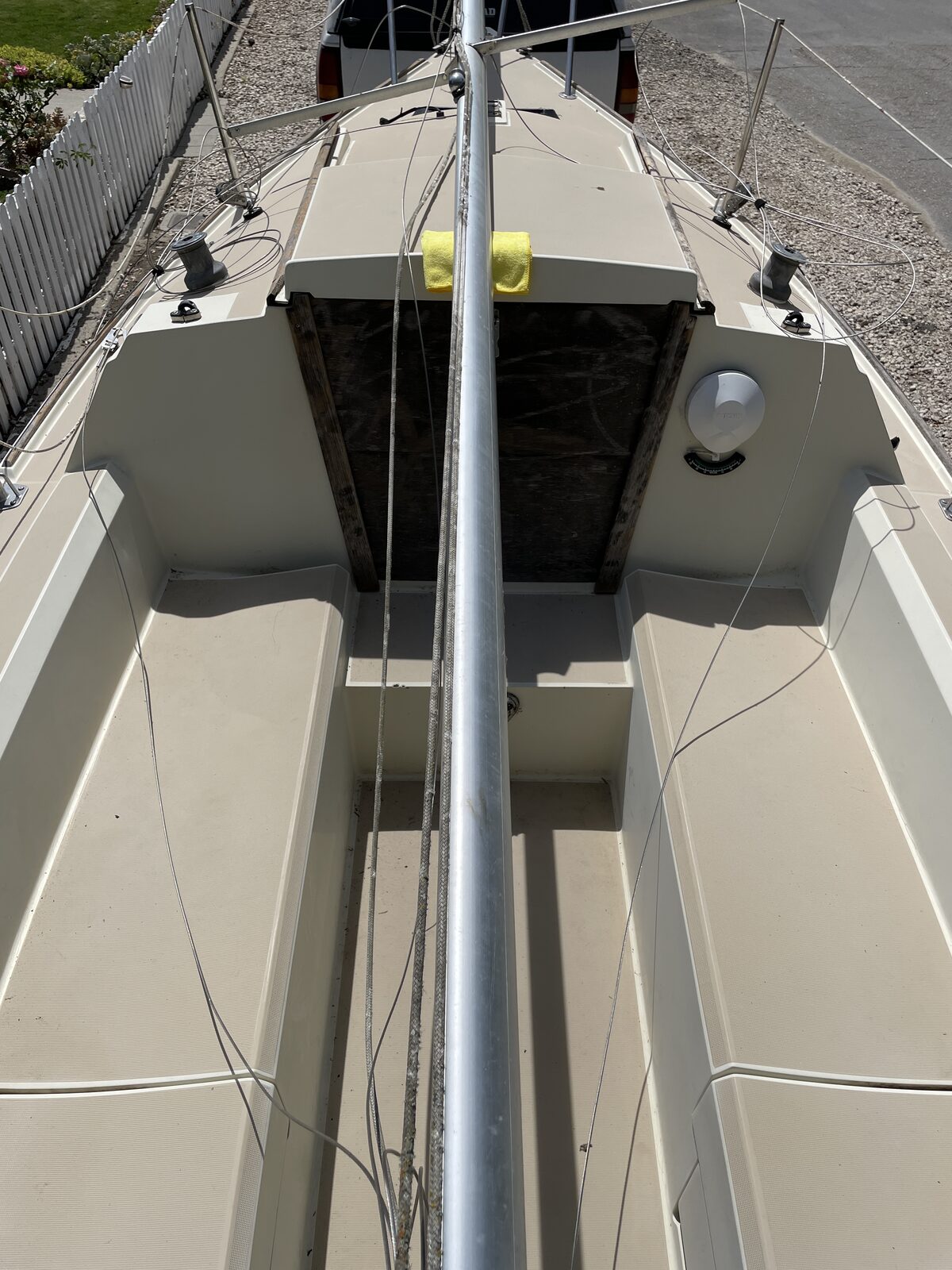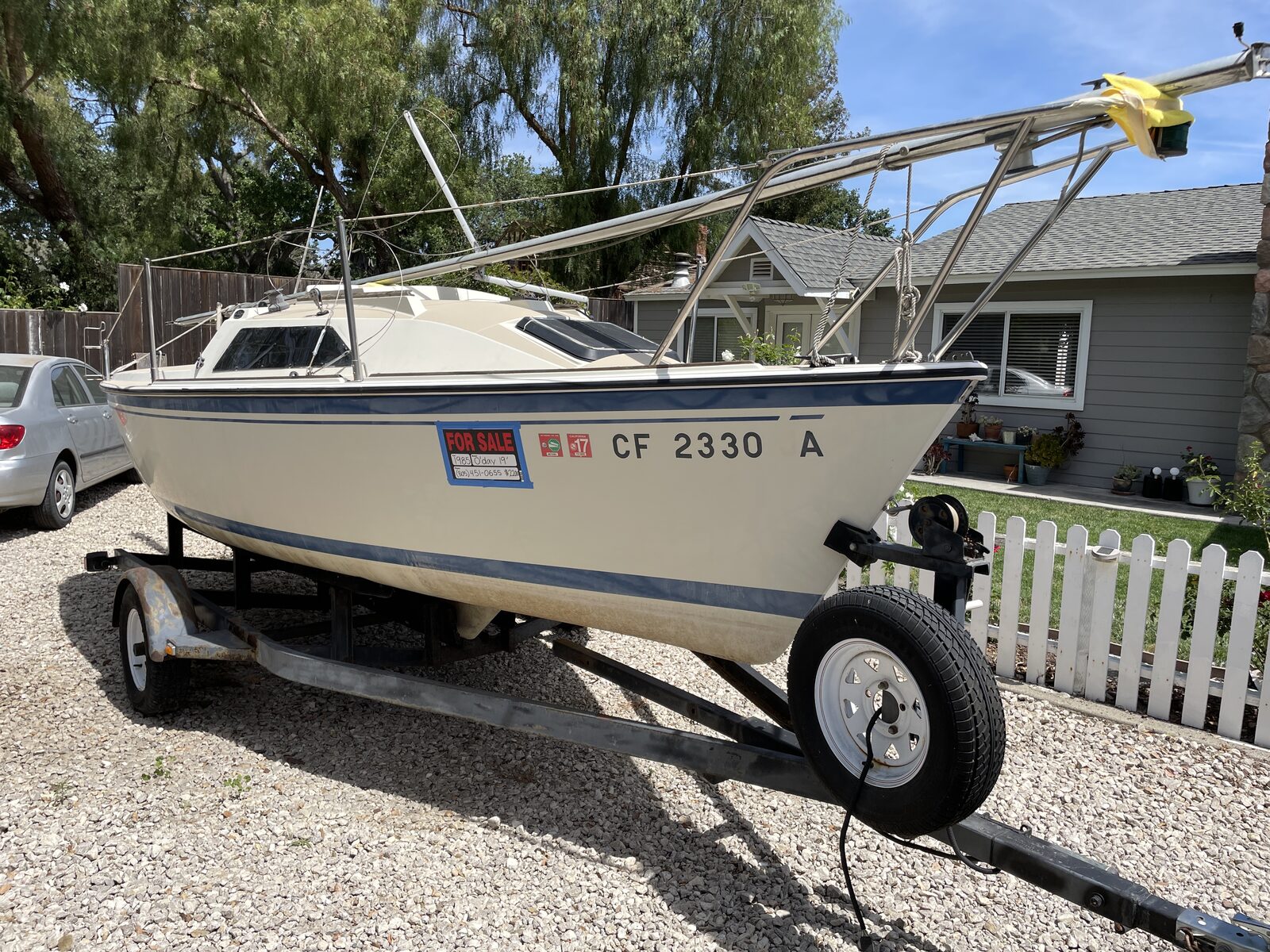 Our family's 1985 O'Day 19' trailer-sailer. She's been sitting on the trailer for the last few years. The bones are solid, the hardware is all there, and the interior has that classic O'Day charm.